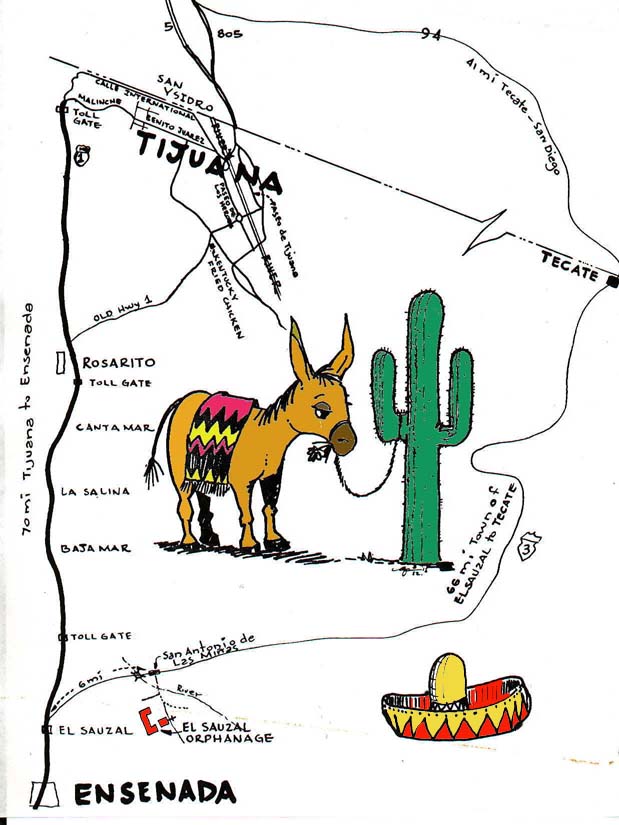 Usted notará que a la derecha están unas pequeñas construcciones que son un pequeño restaurante y dos tiendas pequeñas. De vuelta hacia la derecha sobre inmediatamente después de las tienda Hay un cerco de alambre de púas a la izquierda y un terreno baldío, continua sobre el camino y asegúrese que respetar los señalamientos haciendo bien su alto. La policía local esta esperando que Usted haga bien el alto. Después estará pasando sobre un puente de concreto, continué hasta llegar a la siguiente intersección, donde a la derecha está una barda de bloque / concreto, que continuará hacia terminar en las puertas de la Casa Hogar.